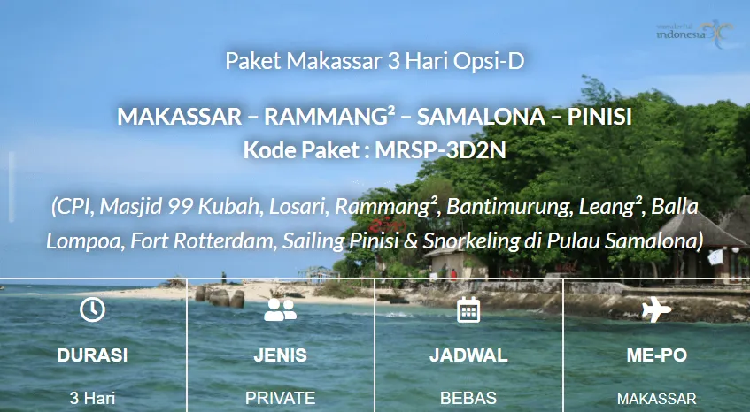 Anda akan dibawa berwisata selama 3 hari dengan mengunjungi beberapa objek wisata di Makassar sesuai yang tertera dalam itinerary di bawah, dan akan menginap 2 malam sesuai hotel yang akan dipilih.